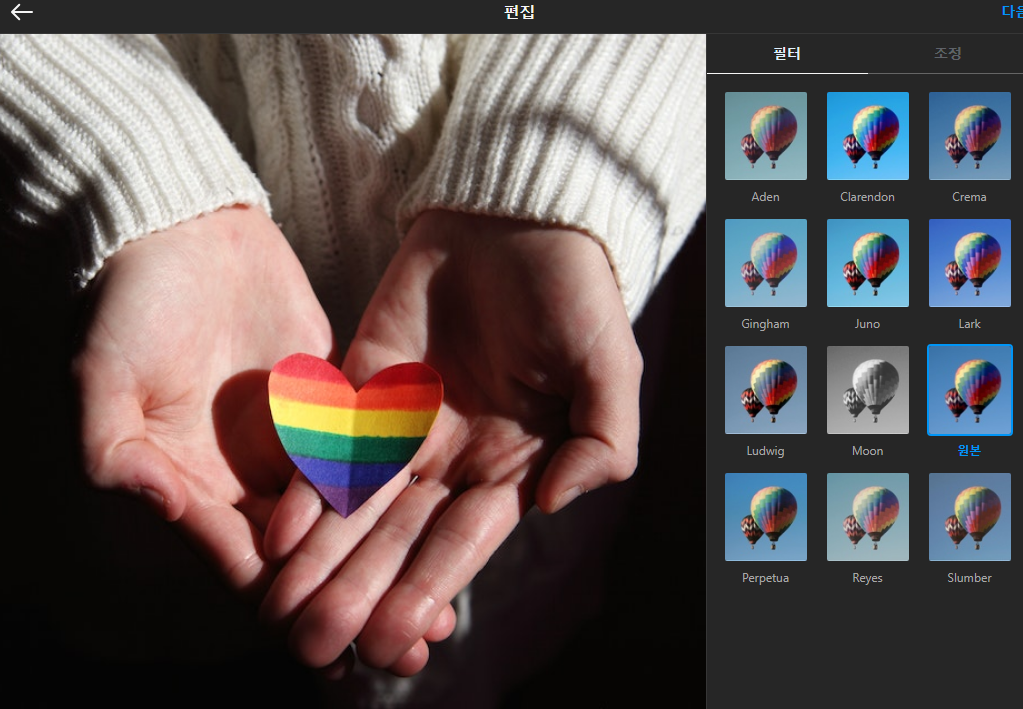 인스타그램 PC 버전에는 고급 필터는 아니지만 필터가 있으며 밝기, 대비, 온도 등도 마음대로 조절할 수 있습니다. 그래서 원하는 경우 이 기능을 사용할 수 있어요.