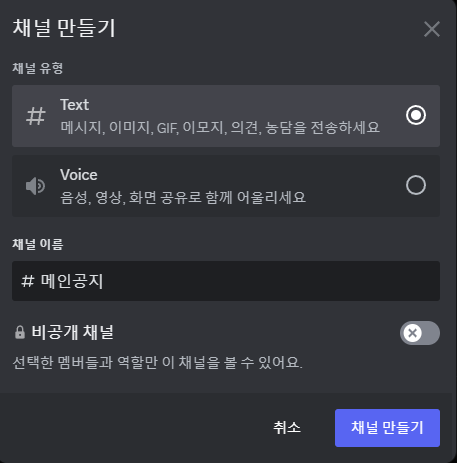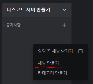 카테고리 공지사항이 잘 보이시죠? 이번엔 채널을 만들어야해요 빈 공간에 우클릭 누르고 채널만들기를 눌러주세요. 채널 유형은 두가지로 텍스트(채팅채널) 보이스(음성채널)로 나누어져있어요. 채널이름을 정해주시고 채널 만들기 눌러주세요.