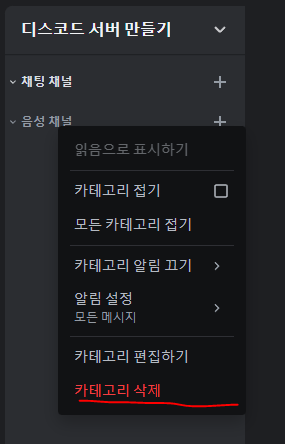 기존에 디스코드에서 만들어준 채팅채널과 음성채널, 카테고리들을 삭제 먼저 해줄게요. 수정도 가능하지만 하나씩 할 예정이기에 깔끔하게 삭제해줍니다.