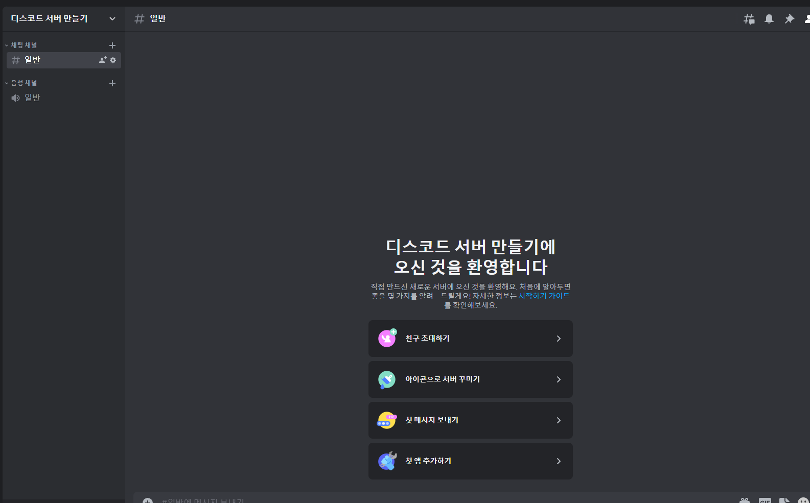짠~ 이렇게 쉽게 서버를 만들었습니다. 처음 만들면 이렇게 일반 채팅채널과 일반 음성채널 하나씩 존재하는데요 여기를 저희가 예쁘고 화려하게 꾸며볼거에요. 어렵지 않으니 잘 보고 따라해보세요.