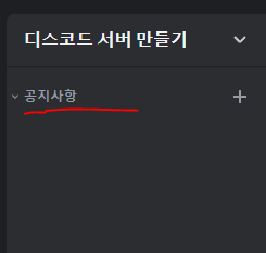카테고리 밖으로 '메인공지'가 안들어가져있는 상태이기에 메인공지를 드래그하여 공지사항 카테고리에 넣어주세요! 저는 다른 채팅채널을 더 만들었습니다.