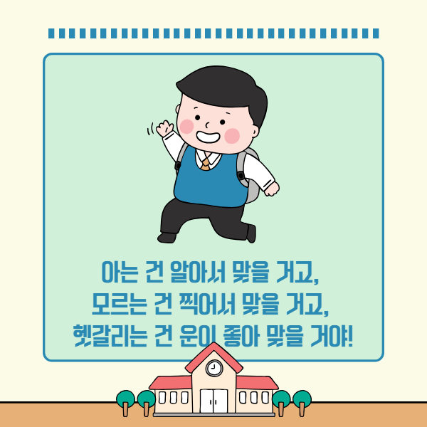 - 아는 건 알아서 맞을 거고, 모르는 건 찍어서 맞을 거고, 헷갈리는 건 운이 좋아 맞을 거야!
