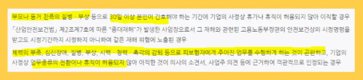 일을 전혀 할 수 없는 상태의 의사의 진단서가 있어야 하며, 회사에서 병가나 다른 직무로 변경이 어렵다는 의견서를 써주어야 합니다.