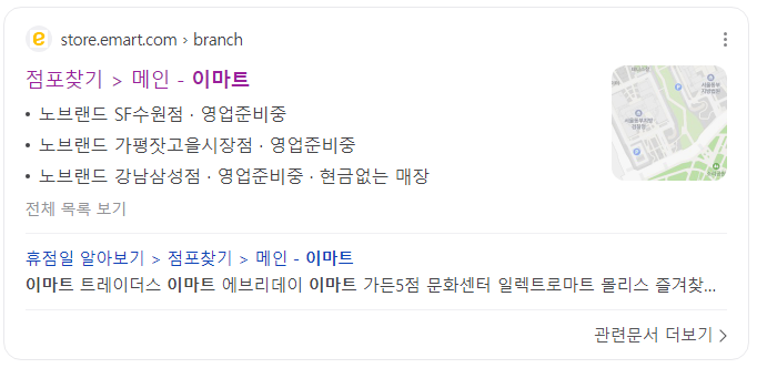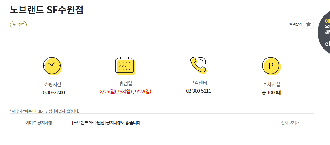 임의로 노브랜드 SF수원점을 검색해봤는데 영업시간과 휴점일, 고객센터 번호까지 바로 확인할 수 있네요.