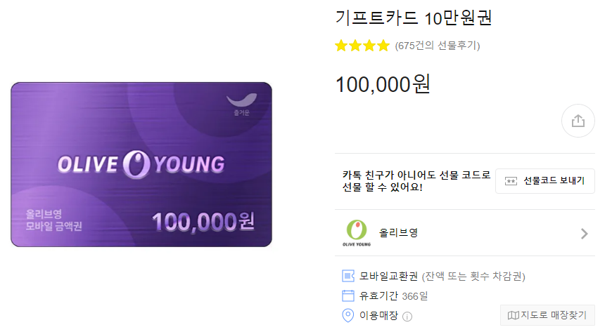 올리브영 상품권도 추천드립니다. 선물 받을 친구가 직접 올리브영에서 고를 수 있기 때문에 아주 편리합니다.